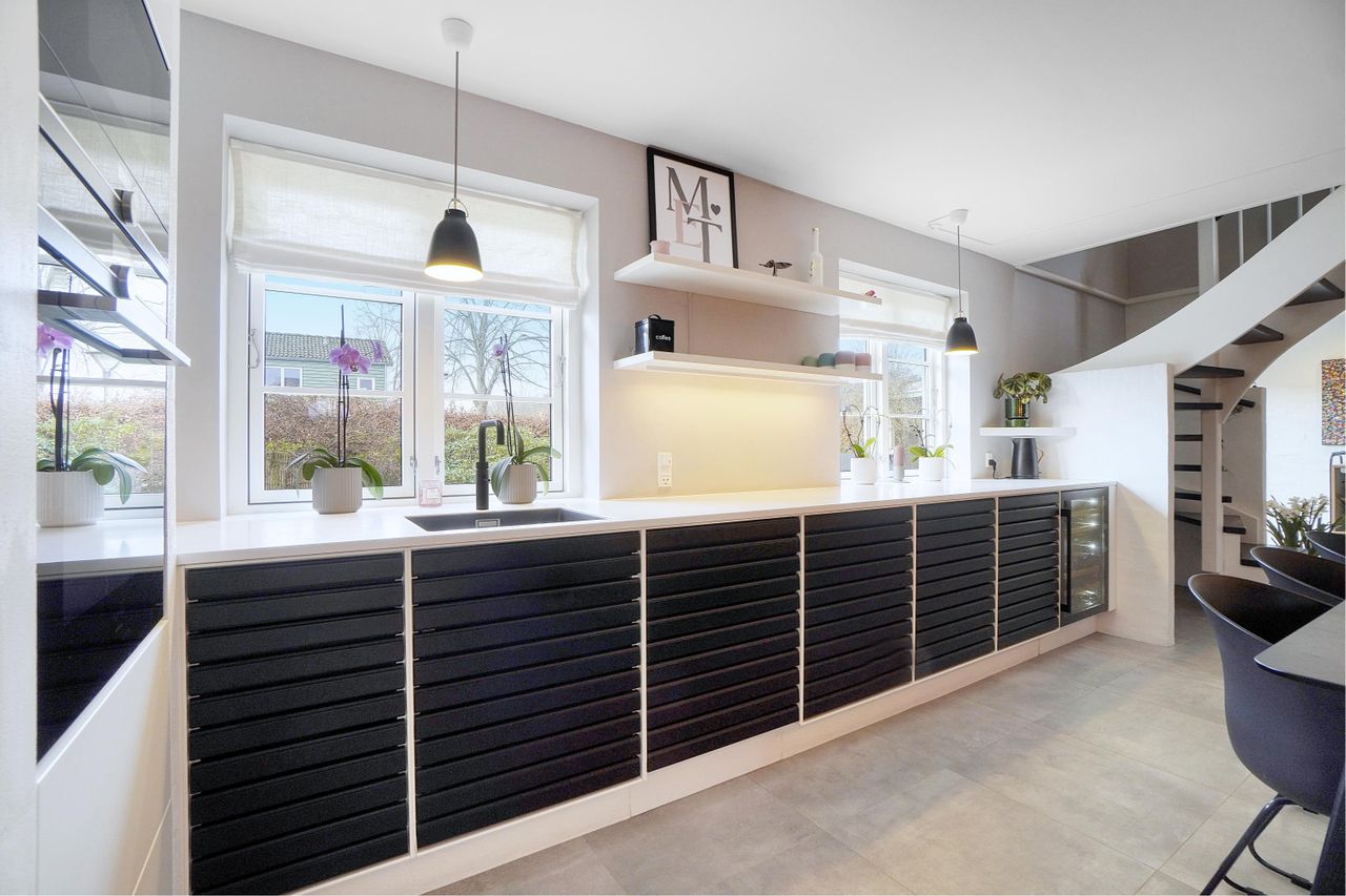 Køkkenet er stilrent indrettet med sort/hvide kontraster og store, smukke fliser i et