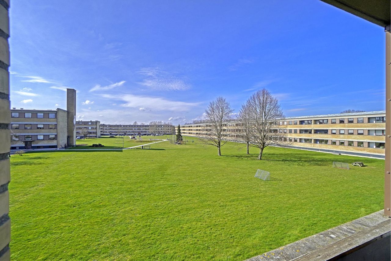 med plads til leg og boldspil, legeplads og super parkeringsforhold lige udenfor opgangen.