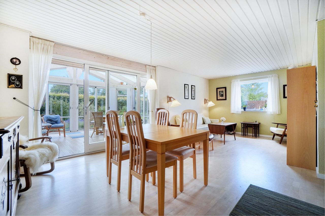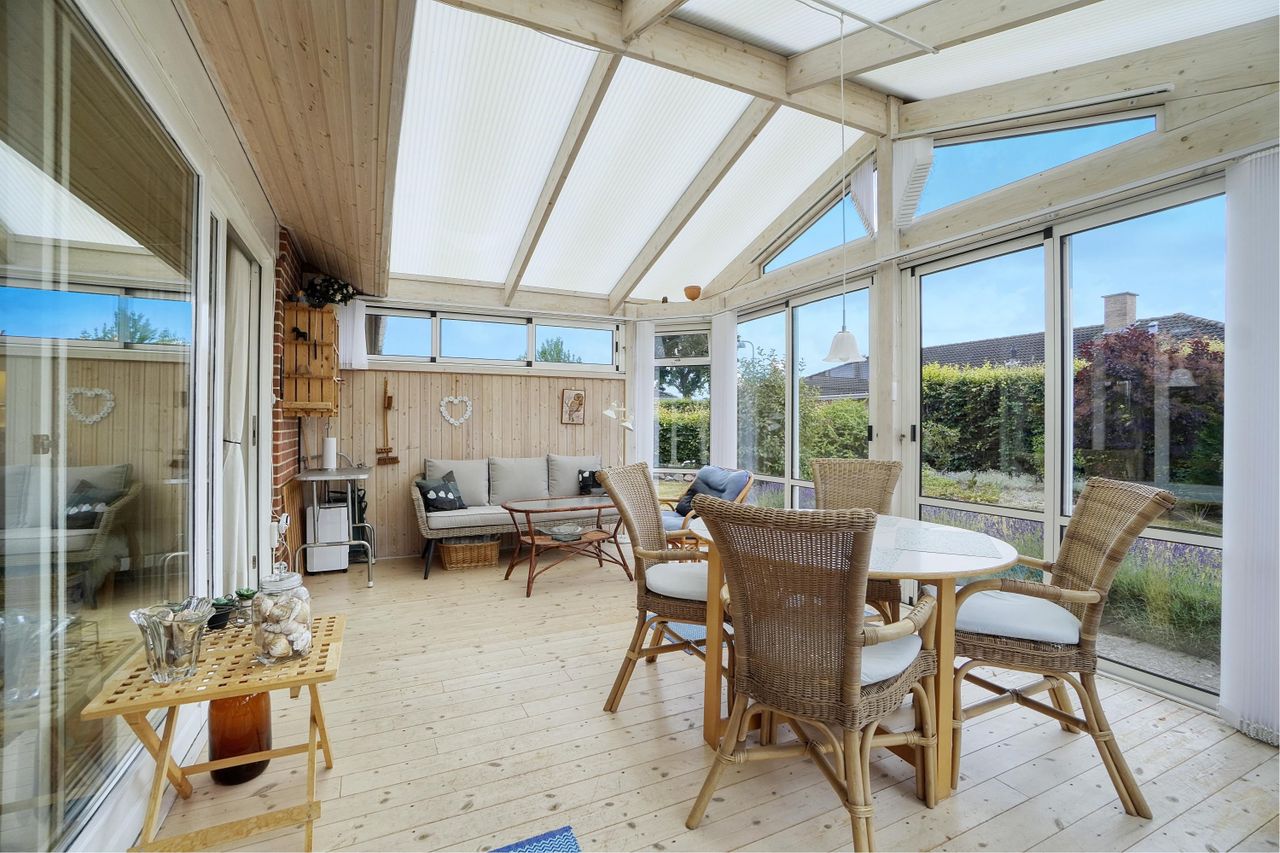 stor stue med udgang til en charmerende udestue, opført med glasfacader, der lukker kaskader af lys