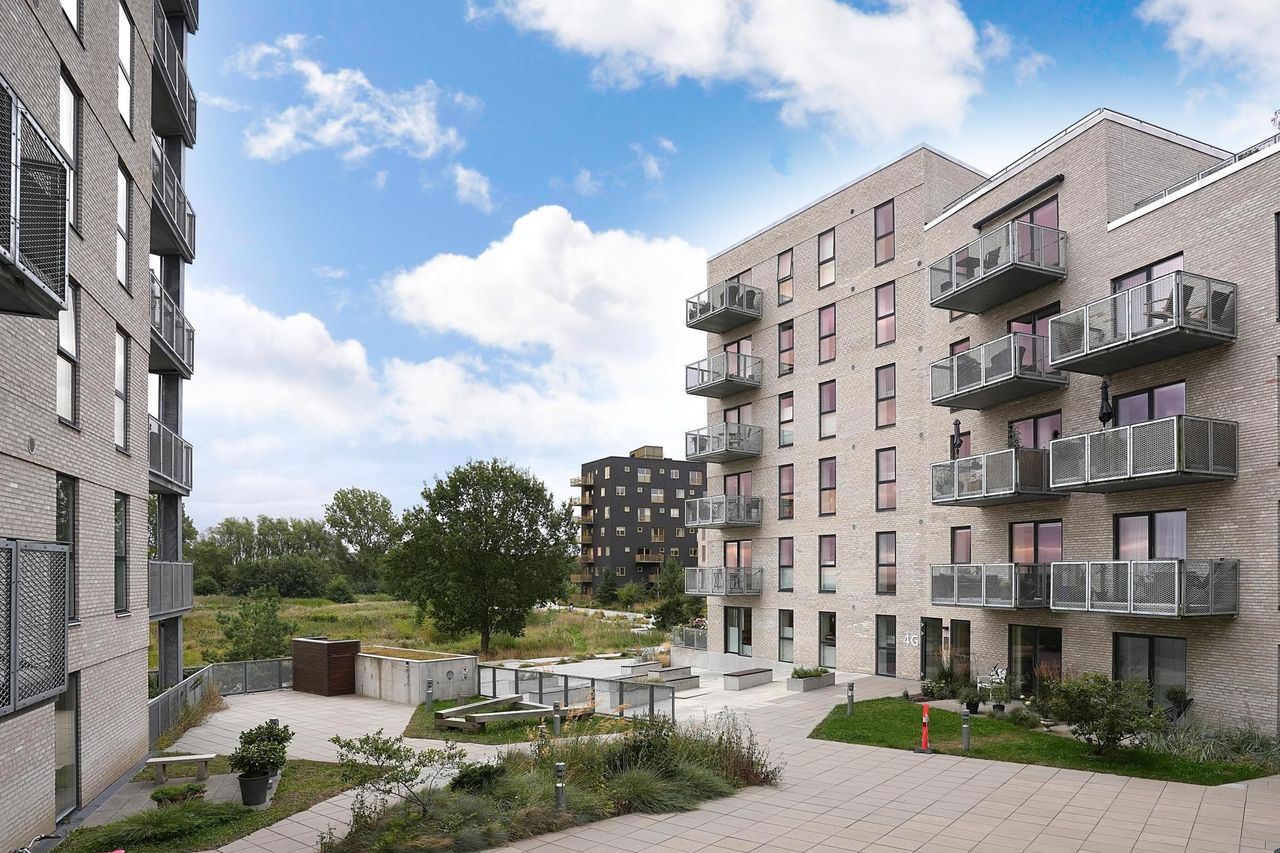 Lejligheden ligger på første sal i en moderne ejendom fra 2017, og der er selvfølgelig elevator, også direkte fra parkeringskælderen, hvor du har din egen plads. Beliggenheden er noget for sig. Du bor fredeligt med naturen som nabo, men stadig få skridt fra byens mange muligheder: caféer, restauranter, specialbutikker, stationen, havnen og det hele er nemt at nå til fods eller på cykel.